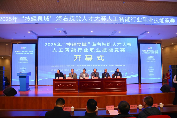 2025年11月8日,由济南市人力资源和社会保障局、历下区人民政府联合主办,历下区人力资源和社会保障局、山东省人工智能协会、山东城市建设职业学院、山东省物联网协会、山东青鸟工业互联网有限公司共同承办的2025年“技耀泉城”海右技能人才大赛人工智能行业职业技能竞赛总决赛在我校正式拉开帷幕。大赛以“以赛促学、以赛促练、以赛促评、以赛促建”为核心宗旨,聚焦人工智能产业发展痛点与岗位需求。本次竞赛由山东青橙数字科技有限公司、北京康鹤科技有限责任公司、山东硕博智能科技有限公司、广东宇洪科教设备有限公司提供专业技术支持,吸引了来自全市各区县、企业、院校的240余名技能精英同台竞技,围绕大模型微调应用、物联网安装调试、智能硬件装调应用、信息通信网络运行管理、飞行器人工智能技术应用等五大前沿项目展开激烈角逐,这也是济南打造“AI泉城”品牌、夯实技能人才根基的重要实践。